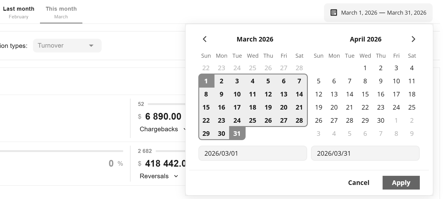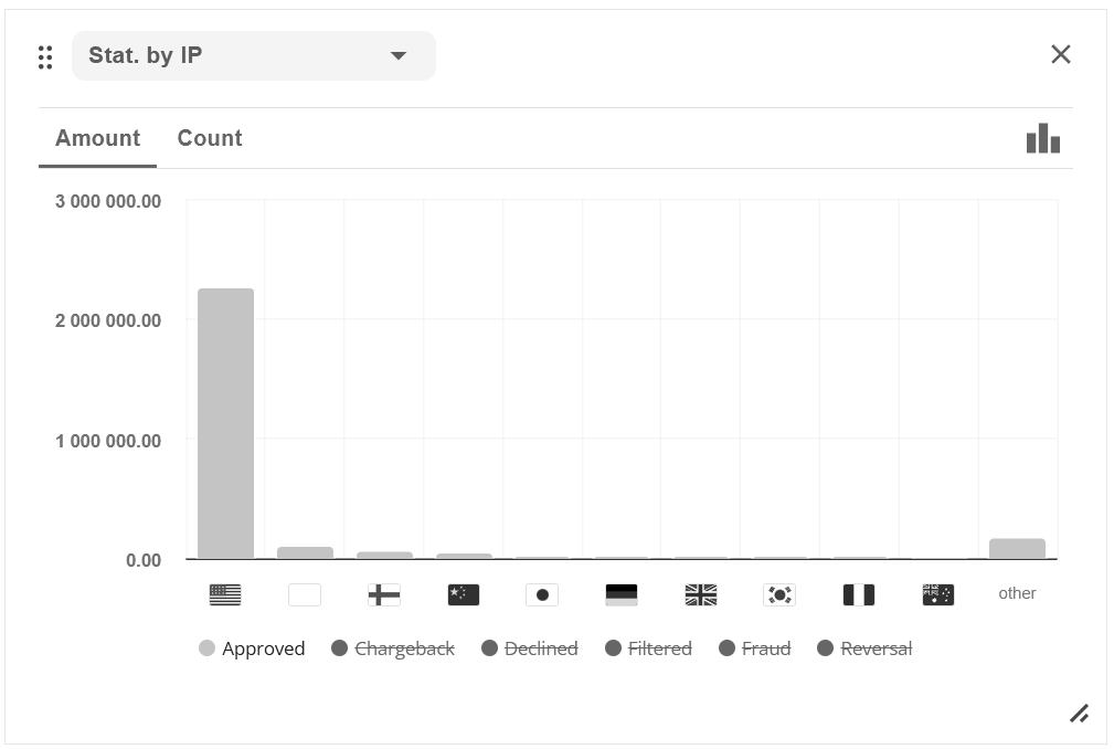 button: the ratio by volume of transactions or by amount of payments, as well as by type of transactions (sale, capture, transfer, etc). Globalpay Payment Gateway also displays statistics on negative activity and earnings.