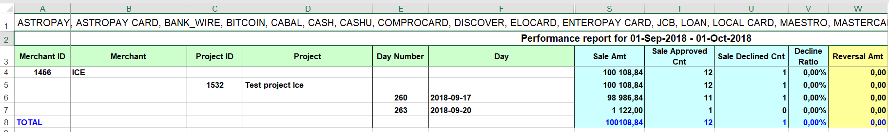 This report displays the financial flow for the specified period. It also allows to view the number of successful and unsuccessful transactions. Flexible criteria setting allows to get the needed data: date range and type, currencies, card types, grouping of data.