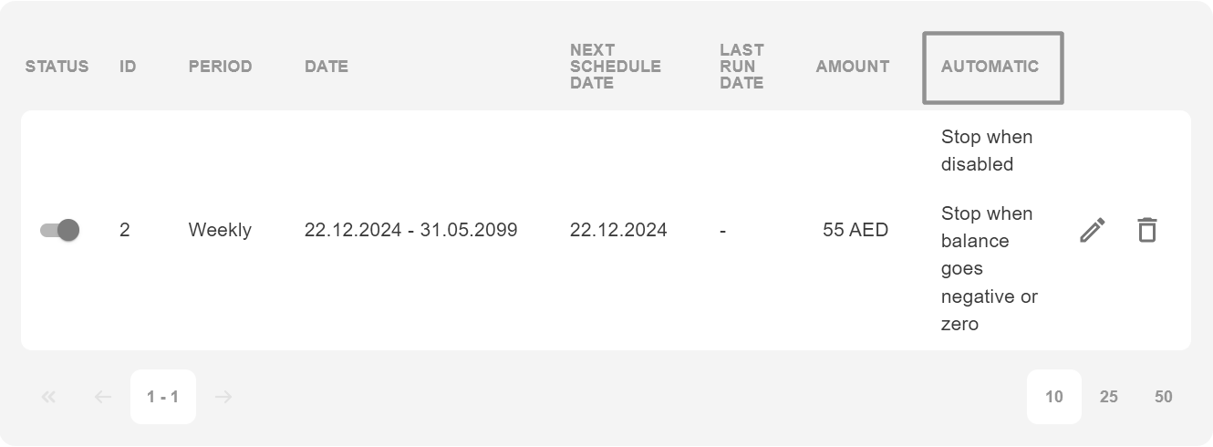 This functionality helps to configure a monthly/weekly fee, which can be set up on the appointed dates every month/week. Scheduled for balance adjustments can be made via Add+ button :