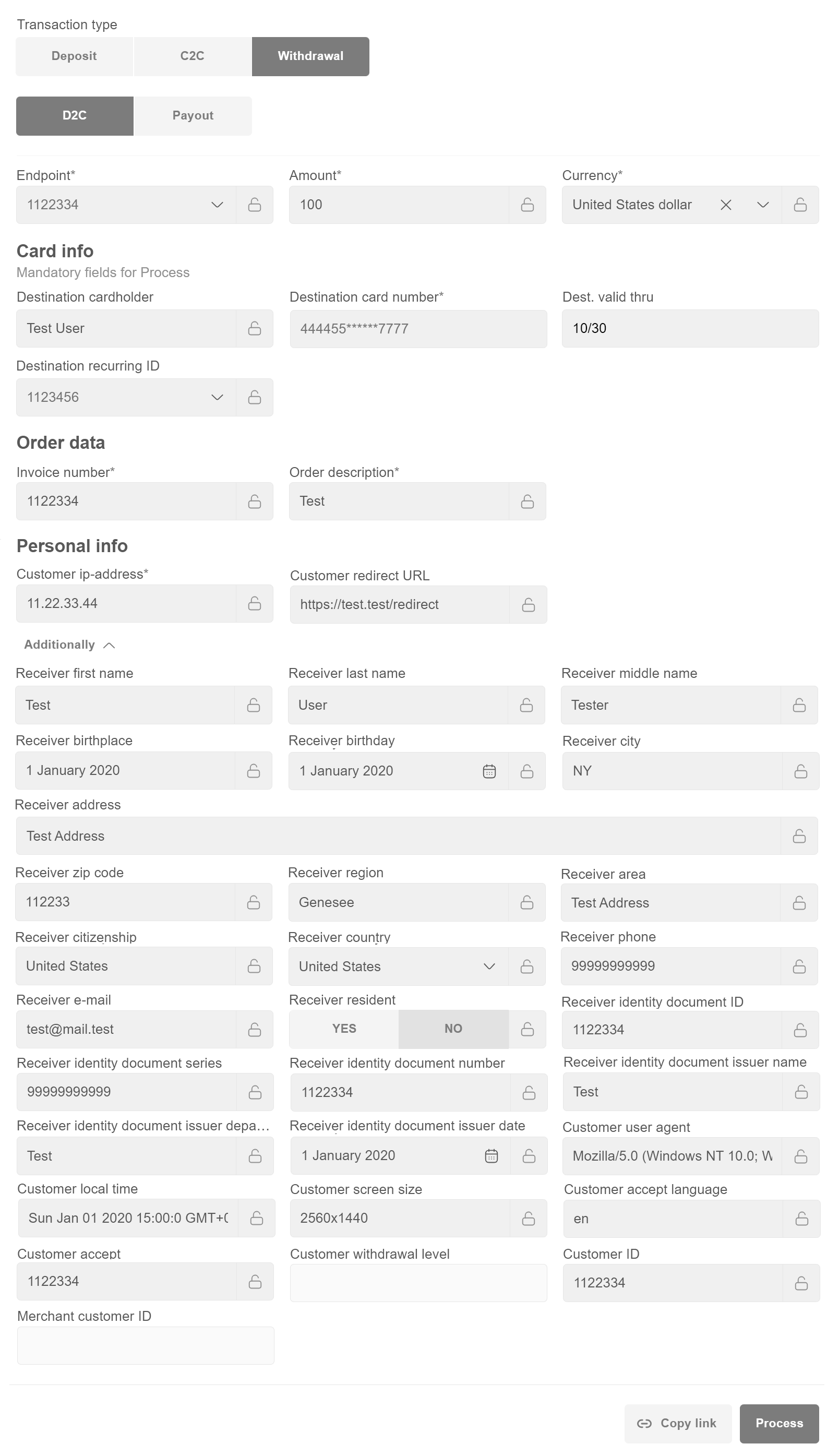 The Merchant fills the cardholder data or use recurring IDs for both sender and receiver of funds directly on VT and initiates transfer processing with “Process” button. In this case the transaction must be processed through the non3D channel, which is not common for C2C transfers.